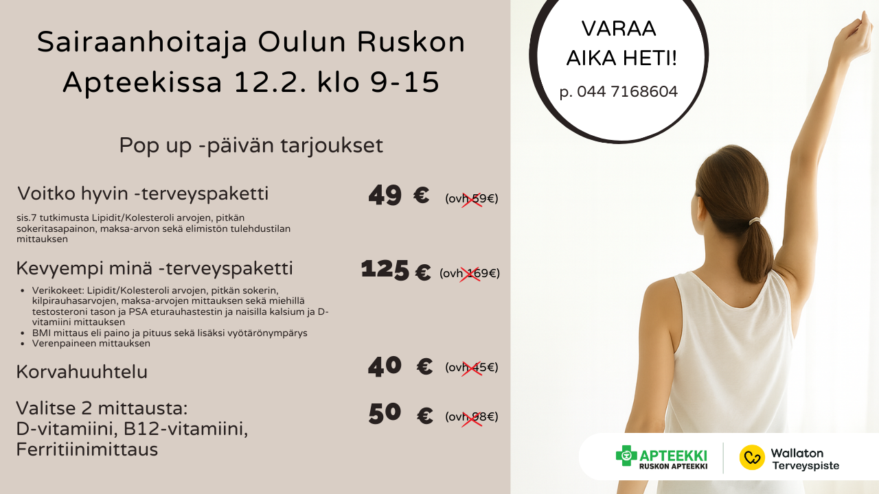Saat meiltä lääkkeet, vitamiinit ja muut ravintolisät, lääkinnälliset laitteet ja tarvikkeet, ihon- ja haavanhoitotuotteet, täydennysravintovalmisteet sekä eläinten lääkkeet ja hoitotuotteet.